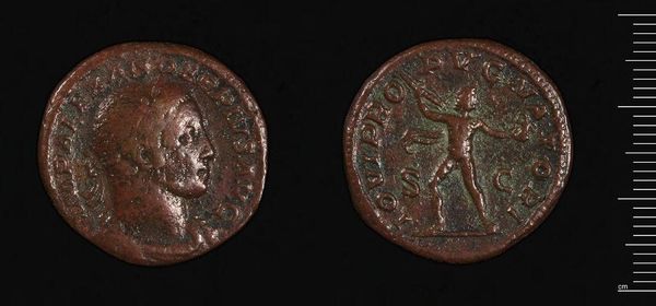 Editor: Here we have a sestertius, attributed to Trajan Decius, though it’s actually a forgery. The copper is heavily patinated. How should we approach analysing a piece like this? Curator: Let us proceed by considering the composition. Note the circular format, divided into fields of text and figuration on either side. Observe how the incised profile dominates one side, its lines and texture defining the emperor’s likeness. Do you notice the interplay between the raised surfaces and the recessed inscriptions? Editor: Yes, the contrast is quite striking. Does the materiality of the piece—the worn copper—affect how we perceive it? Curator: Indeed. The corrosion and wear contribute to a sense of age, despite its forged nature. The forger understood the visual language of ancient coinage, creating a powerful illusion through form and texture. It is through the careful study of these elements that we understand the piece. Editor: I see. So, even a forgery can offer valuable insights. Curator: Precisely. It invites us to consider authenticity and representation.
