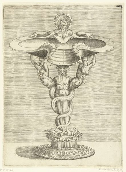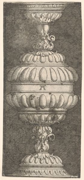 Albrecht Altdorfer's "Bokaal met drie kleine granaatappels" showcases a meticulously rendered vessel, articulated through the stark contrast of line and shadow. The artist’s concentration on form and texture gives the goblet an almost palpable presence. The structure of the "Bokaal" is an interplay of repeated, rounded shapes, creating rhythm and visual harmony. Notice how the eye is drawn upwards, guided by the verticality of the stem and the tiered arrangement of its components. The repetitive motif of curved segments, reminiscent of both petals and fruit, binds the composition together, suggesting a convergence of nature and artifice. Altdorfer’s precise technique invites us to consider how the print’s materiality informs its meaning. The density of lines creates depth, while the monochrome palette emphasizes the object's sculptural qualities. Through this rigorous formal approach, Altdorfer presents a compelling meditation on the relationship between ornamentation and function, craftsmanship and symbolism.
