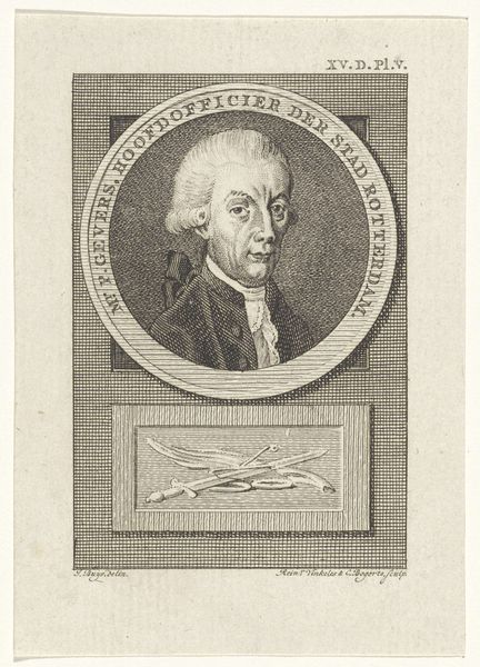 This is Reinier Vinkeles's "Portret van Jan Jacob Elzevier", an engraving from the late 18th century. Initially, the tight hatching might strike you as merely descriptive, meticulously rendering the sitter and objects in a seemingly straightforward manner. Yet, observe how Vinkeles's strategic use of line destabilizes traditional portraiture. The subject, framed by a circle, hovers above a rectangle containing a sword and what seems to be a bag. These shapes are set against a neatly organized grid pattern. The semiotic tension emerges here: a tension between the aristocratic portraiture and an almost unsettling juxtaposition of circles and rectangles, and symbols of status. The grid, the circle, the rectangle: forms suggest a world striving for order, yet the arrangement hints at underlying structural paradoxes. Vinkeles doesn't just depict; he subtly questions the codes of representation itself, leaving us to ponder the unstable relationship between form and meaning.