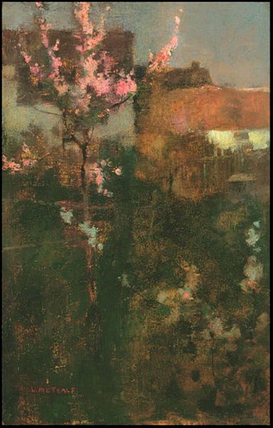 Editor: So this is “Landscape: Blossoming Red Almond (study)” by John William Godward, painted in 1912 using oil paints. I’m struck by how gentle it feels; the colors are soft and muted. How do you interpret this work? Curator: Notice how the almond tree, exploding with blossoms, dominates the foreground. Spring has forever been associated with the concepts of rebirth, regeneration, and hope. Even in 1912, do you think these symbols offered an intentional contrast to the tumultuous reality brewing in pre-war Europe? Editor: That's interesting. I was focused on the surface beauty, but it's true, 1912 was a fraught time. Curator: Exactly. Consider also the little buildings nestled within the landscape, hinting at a human presence integrated within nature's cyclical patterns. This subtle harmony speaks to the continuity of life and, perhaps, a desire for enduring peace, represented through pictorial conventions inherited from the Impressionists. Do you find the visual symbolism here reassuring? Editor: I do now that you point it out. The buildings are humble, and everything seems integrated into the land itself. It feels less like a depiction of a real place, more a scene from a memory. Curator: Cultural memory, perhaps? Godward is inviting us to participate in a visual tradition loaded with such symbolism. Ultimately, it is through such simple, hopeful imagery that we remember and perpetuate essential truths, and these become symbols through an ongoing cultural ritual of remembering. Editor: I see what you mean. It’s like a visual mantra for peace, passed down through time. Curator: Precisely. It encourages active viewership across time; not merely an image, but a carrier of emotional, cultural, and psychological weight. It carries a cultural memory forward. Editor: That really reframes my understanding. I had initially seen it as just a pretty picture. Now I see how those blossoming almonds connect us to much bigger ideas and memories.