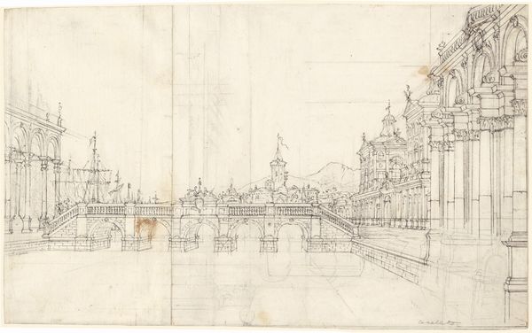 Curator: What strikes me immediately is the almost ethereal quality of this drawing, seemingly suspended between architectural precision and atmospheric transience. Editor: Indeed. This is a 17th-century pencil drawing by Jan Abrahamsz. Beerstraten, titled "De Waag (Sint Antoniespoort) op de Nieuwmarkt te Amsterdam." It depicts the De Waag building. Curator: The use of pencil lends itself to such tonal subtleties, almost vibrating on the page. It allows Beerstraten to emphasize the complex geometry and varying textures of the building. Editor: This area, Nieuwmarkt Square, became an important hub in the city in the 17th century, transforming into a center for trade and public life. Beerstraten gives us access to this chapter of Amsterdam's transformation. Curator: The eye is led upward along the facade, and there's something very calculated in the compositional choices; it’s a delicate interplay of lines. What statement is Beerstraten making by selecting this perspective? Editor: Situated originally as one of Amsterdam's main gates, De Waag played a pivotal role in the city's defense and later in commerce. Capturing it became a point of reflection upon the city's growing importance. It marks Amsterdam’s political stability and commercial dominance. Curator: Thinking about the pencil as a medium, the relative simplicity—the drawing stands in contrast to more baroque displays of material excess so popular elsewhere in Europe at this moment. The subtle lines and emphasis on structure seems quintessentially Dutch in its own way. Editor: I agree. In terms of urban studies, a drawing such as this also reminds us of Amsterdam's ambition at the time. To envision urban expansion and influence requires belief in the possible. Beerstraten presents us not only with architecture, but this confidence. Curator: Looking at this piece makes me realize just how powerful line and form can be when distilled so expertly. Editor: Precisely. This work gives us access to art history, politics, commerce, and perhaps even the mindset of an expanding Dutch Golden Age through Beerstraten’s talented draftsmanship.