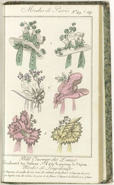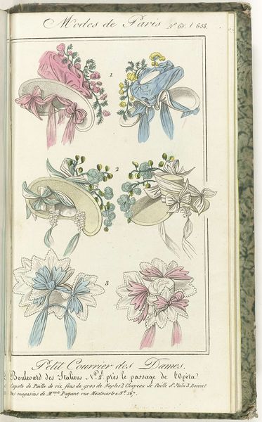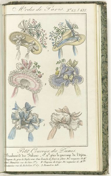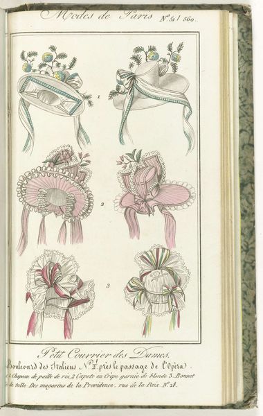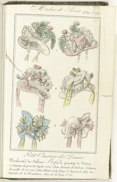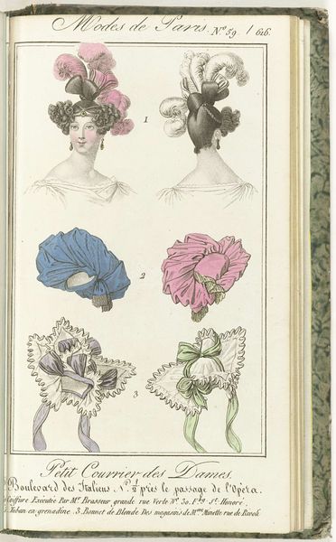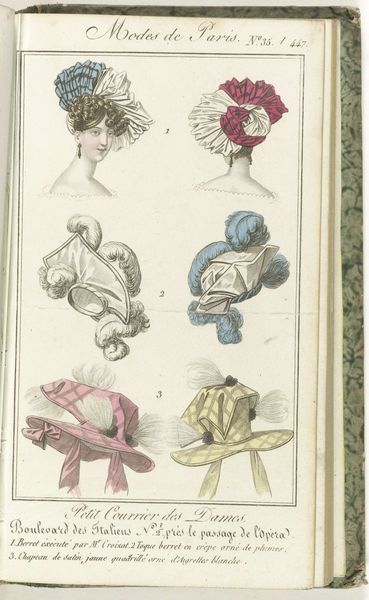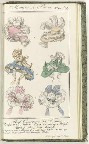 This is a page from Petit Courrier des Dames, a Parisian fashion magazine from 1827, printed using engraving and hand-applied color. The image shows six different hat designs, each numbered and described below. Magazines like this one played a crucial role in shaping fashion trends and disseminating them among the upper classes. In this period, Paris was the undisputed center of the fashion world, and magazines such as this helped maintain this position. The designs reflect the broader social and economic context of post-revolutionary France, in which fashion became both an indicator of social status and an industry in its own right. It is also interesting to note the reference to specific boutiques and addresses in Paris, which points to the close relationship between the magazine and the fashion industry. Understanding these historical and institutional contexts is essential for interpreting such an image, and one would want to research fashion history and the history of print culture to fully understand it.