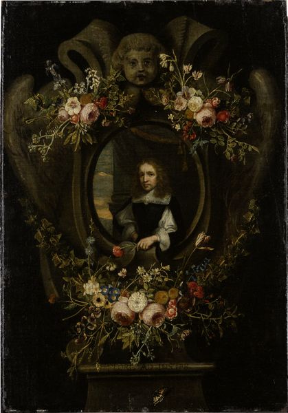 Curator: Before us we have “Feigned Sculpted Bust of the Blessed Hieronymus Werdanus Set in a Feigned Stone Cartouche, Decorated with a Swag and Two Bunches of Flowers” dating to before 1676, crafted by Wouter Gysaerts. It's an oil painting that really plays with illusion. Editor: My initial impression is…melancholy masquerading as beauty. Those flowers are lush, but they're clinging to a stone effigy set against deep shadows. It feels like a monument erected not for celebration, but perhaps, remembrance. Curator: The painting definitely embodies vanitas themes, reflecting on mortality. Gysaerts was working in a period where such allegorical works were quite popular, often commissioned to adorn private collections of wealthy patrons. It reflects a cultural preoccupation with life’s brevity and the transient nature of beauty and earthly achievement. Editor: Right, you can almost smell the wilting flowers! The "feigned" aspect is fascinating though. He's not just painting a sculpture, he's painting a *painting* of a sculpture, blurring lines of reality, representation, artifice. It reminds me of a stage set, everything carefully arranged, playing on your perception. The monochrome of the bust pulls me in. It stands out by not trying to stand out with color. Curator: And think about who Werdanus was – a theologian, someone whose work would be enduring, yet here he’s framed by these very ephemeral floral arrangements. This juxtaposition was intentional, meant to prompt reflection on contrasting states of being, of the earthly and the divine. Editor: It's an interesting contrast! It’s a really self-aware Baroque wink. The heavy symbolism combined with the obvious artifice makes me think of beauty as a very deliberate act, not necessarily a natural state. Almost, an art project itself. It speaks of both reverence and theatricality. Curator: Precisely! These pieces were rarely straightforward celebrations but instead operated within specific cultural frameworks, addressing their viewers on various levels of symbolic understanding. Gysaerts really puts into action these frameworks here. Editor: Well, I stepped into a garden of manufactured contemplation and walked out considering where I stand amidst the real and the fake! It's the tension that stays with me. Curator: And for me, reflecting on the historical context highlights how profoundly ingrained the human need to ponder the big questions is, across centuries and artistic styles.