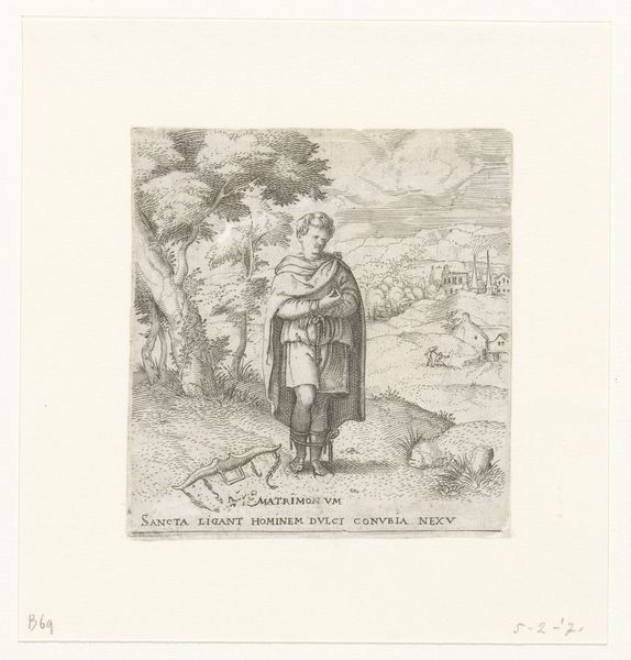 Editor: This is "Ballingschap," or "Exile" in English, an engraving made sometime between 1533 and 1567 by Enea Vico. It's quite small, and rendered with such fine lines! What I notice right away is this central figure, this bearded man holding a bird. How would you interpret this piece? Curator: This image pulses with symbolic resonance. Exile itself is not merely physical displacement, but a severance from identity, history, and belonging. The man's clothing suggests a certain status, perhaps even royalty, now stripped bare. Consider the bird; what does it signify to you? Editor: I suppose the bird on his wrist is a falcon. Maybe it signifies the freedom that he no longer has, or the high status that has been stripped away, like you said? Curator: Precisely! Falcons often symbolized nobility and freedom. The bird's captivity with him can suggest a loss of status or power, a kind of shared fate. The Latin inscription "EXTORRIS PATRIAM DVLCESQ[UE] REUNQVO PENATES EXILIVM" tells us he is banished from his fatherland. What emotions do you feel as you look at this image? Editor: Sadness and maybe some empathy? I see a fallen man, no longer who he once was. He's in exile, without a home. Curator: Exactly. The engraving captures the somber reflection on loss of home, status and identity. But in art historical symbolism there is also endurance. What survives loss? Consider the symbolic power of exile as a test to character and perseverance, perhaps even rebirth. Editor: It is interesting to see how the symbolism elevates the artwork, layering new insights. Curator: Agreed, reflecting upon this historical image prompts deeper understanding, revealing the story behind visual language that art embodies and passes down over centuries.