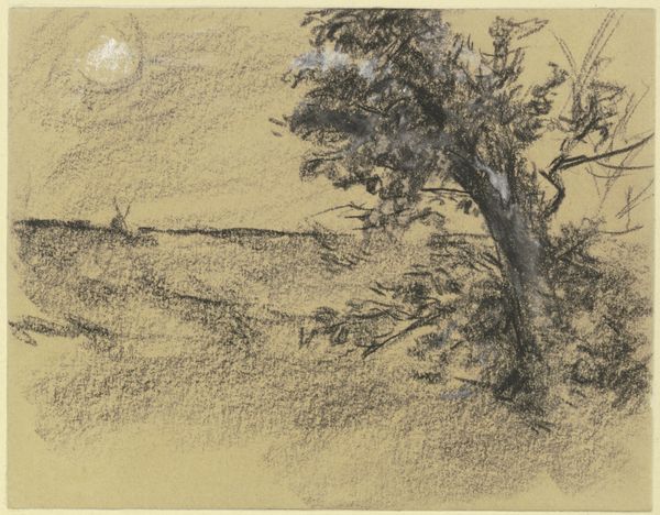 Curator: This work, "Hohlweg in Burgund mit Baumwerk zur linken Seite," or "Hollow Path in Burgundy with Trees on the Left," was created in 1856 by Karl Peter Burnitz. Editor: It feels somber, almost monotone, yet with a surprising depth. The way the path winds its way into the distance creates a real sense of being there, but what's most striking is the stark materiality of the paper contrasting the tree foliage. Curator: Yes, the starkness certainly enhances the texture. Burnitz primarily used pencil, charcoal, and chalk on paper. The labor intensive act of layering those different materials gives the foliage life despite the limited palette. There's also a textural play with how the trees and foliage contrast with the smoother treatment of the sky, suggesting it was produced with visible, almost rushed strokes, which also affects the work's social context. Editor: That's an interesting observation about the textural contrasts. The path, leading into the hills, evokes ideas of journey, struggle, perhaps even a veiled critique of land ownership and its impact on rural communities at that time. Romanticism wasn't just about pretty landscapes; it often highlighted the complex relationship between humans and the natural world. Consider, too, the era, where industrialization prompted a turn toward landscape paintings as emblems of lost identity and the burgeoning loss of our original landscape and environment. Curator: Absolutely, the very means by which Burnitz crafted this landscape also speaks to class dynamics. Graphite, chalk, charcoal – relatively accessible materials then compared to say, oil paints. This aligns with broader Romantic notions of elevating craft and finding value in what’s immediately available, not necessarily luxurious. Editor: Right, and thinking of who these landscapes were made for – affluent city dwellers perhaps longing for an idealized countryside, far removed from the realities faced by rural workers. Curator: A landscape purchased and consumed like a luxury item. This reframes Burnitz's work in a contemporary consumer context. Editor: Exactly. It becomes not just a serene vista, but an intersectional text of economic disparity and perhaps environmental unease – themes resonating even more powerfully today. Curator: I see it now, an emphasis on both accessible media and environmental context. Well, this dialogue certainly gave me a deeper appreciation for the way these layers intersect. Editor: And for me, thinking about the artmaking process in terms of socio-political dialogue enriches our understanding and expands how we view its relationship to the landscape today.