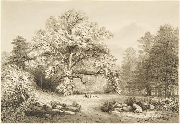 Editor: Here we have J. Hildebrand’s "Ved en mølledam. Sommer-formiddag," or "By a Millpond. Summer Morning," a print from 1881. It strikes me as a really serene depiction of nature, but I wonder… what do you see in this piece? Curator: I see a constructed serenity. Consider the social context of landscape art in 1881. Who had access to such pastoral scenes, and whose labor made that leisure possible? This image invites us to consider issues of class and access to nature. Do you think this idealized image reflects reality, or is it masking a more complex truth? Editor: I suppose I hadn't considered that. It does seem very picturesque. So, you’re suggesting it’s more about a privileged viewpoint than objective representation? Curator: Precisely. Realism, as a style, is always mediated by power. Look closely at the composition—the placement of the trees, the light. It's all carefully arranged to present a particular view of nature: one of tranquility and abundance. But what about the unseen laborers who maintained these landscapes, the social inequalities inherent in land ownership at the time? What are your thoughts on how landscape art either challenges or perpetuates such imbalances? Editor: It’s forcing me to rethink the entire genre, really. It's easy to get lost in the pretty image and miss the critical questions it raises. Thank you! Curator: Indeed. And that’s why art history can be such a potent tool for social critique: it helps us unmask the power dynamics hidden beneath the surface of beauty.