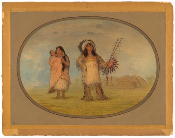 Curator: The watercolor before us, entitled "Nayas Indians," was created by George Catlin around 1861. Catlin devoted much of his career to documenting Native American life. Editor: There's a real tranquility to this piece. The colors are muted, almost pastel, which creates a serene feeling, despite the narrative details present in the image. Curator: It's part of a larger project, conceived during a period when there was great interest, both scholarly and popular, in the "vanishing race" narrative—a product of the Westward Expansion in America. Catlin, although documenting, was still implicated in this historical moment. Editor: I find myself drawn to the teepee in the background. It’s more than just shelter; it seems to function as a visual representation of community and the continuity of their cultural identity. Even the hanging game speaks to that—sustenance, provision. Curator: Absolutely. Think about the act of display inherent to ethnographic projects like Catlin's. The watercolours like this were also commercial ventures. The paintings served a specific purpose: shaping public understanding. He performed as a mediator, and his interpretations certainly carry inherent biases reflective of the historical context of that era. Editor: Indeed. Look at how the figures are rendered, with an emphasis on their clothing and adornments. It’s about detailing these specific markers, but also capturing their individual essence. The symbols used may not always be literally clear, but the intention is obviously deeper than just mere representation. Curator: Yes, and the composition places them between "civilization," as represented by the distant river activity and what would be considered the "untamed" wilderness – both framing their way of life. Editor: This piece feels particularly evocative as a study in contrasts. Catlin walks the line of participant and observer in "Nayas Indians," allowing us access to his perspective, biases included. Curator: Understanding Catlin's work in relation to the power dynamics and politics of its time is important, though it makes appreciating the sensitivity in some depictions challenging. Editor: Despite my reservations about the romanticism present in such work, these watercolors allow me glimpses into what was and what vanished, triggering consideration, and perhaps ultimately, a greater consciousness about a need for genuine intercultural exchanges.