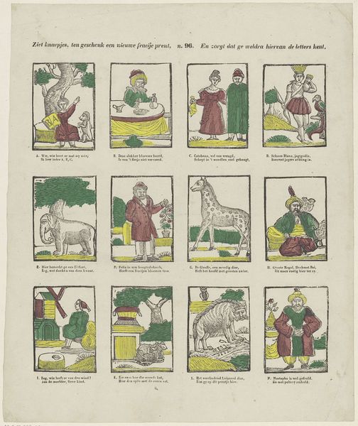 Here we see a print by Lutkie & Cranenburg. Note how it arranges twelve scenes in a grid, each framed by a thin line. The overall effect, rendered in soft blues, browns, and greens, evokes the innocence of childhood learning. Consider how each scene is constructed with simplified forms and outlined in dark ink. These are contained narratives reduced to their essential elements. Look, for instance, at the giraffe rendered with minimal shading and pattern. These function as signs within a structured system of education. Each component, from the figures to the animals and objects, serves a didactic purpose, illustrating a world of knowledge to be acquired. Observe the way in which the print destabilizes the traditional boundaries between art and education, merging aesthetic appeal with instructional intent. This challenges our fixed notions of art's purpose and invites us to consider how visual forms can shape and transmit cultural values.