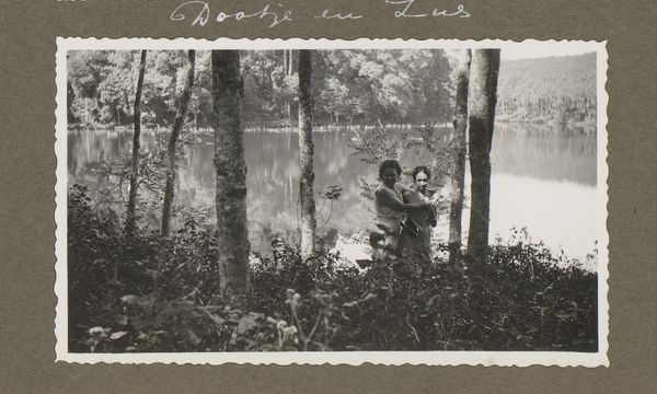 Editor: So this is "Gezelschap met Willem en Norbert van den Berg in een bos in Zuid-Afrika," a photograph taken by Willem Jacob van den Berg between 1967 and 1971. I’m struck by how overgrown it feels, almost claustrophobic, with figures nestled within a dense thicket. What do you see in this image? Curator: The immediate thing that captures my eye is the relationship between the figures and the forest. The artist isn't just depicting a landscape; he’s placing these individuals within a very specific environmental context, embedding them, if you will. Do you get a sense of how this forest setting might be functioning symbolically? Editor: I suppose it could represent the unknown, a sort of untamed world where the individuals are finding their place, or maybe just taking a break. It feels almost Edenic. Curator: Perhaps. Consider the long history of the forest in art and literature as a space of transformation, where societal norms are suspended. These men aren't simply posing for a photograph. They are actively *in* the space, perhaps hinting at cultural memory linked to the wild. Are they explorers, refugees, dreamers? How might their posture, their clothing, hint at their roles within this visual narrative? Editor: Their clothing does suggest they’re just pausing during a journey or exploration. There is an everyman quality in their postures and the lack of drama. Curator: Precisely. This photograph becomes less about individual identity, and more about how human beings position themselves—or are positioned—within nature's overwhelming presence. There is an intrinsic visual tension in play, asking whether they are masters of the natural world, or part of its tapestry. Editor: I see what you mean. It makes me consider my relationship to the natural world. Curator: And that connection is the key. Images like this prompt us to engage not just with art history, but our ongoing human story and interplay between the familiar and the unknown, revealing, again, continuity through these subtle visual cues.