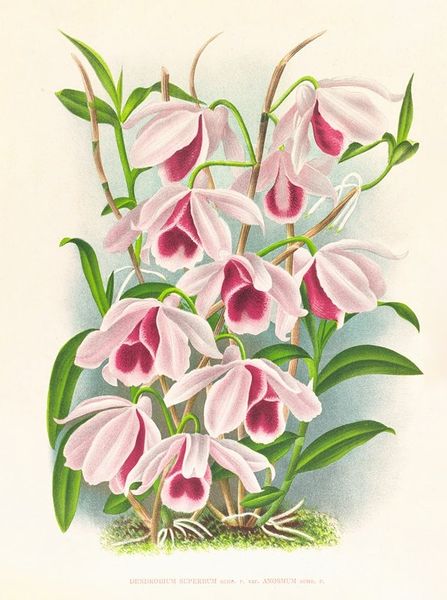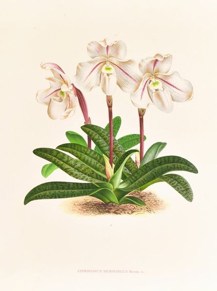 Editor: This is "Cattleya maxima," a painting by Jean Jules Linden, created sometime between 1885 and 1906. It's incredibly vibrant, almost like a botanical illustration. How do you interpret this work in terms of its formal qualities? Curator: Well, considering it through a formalist lens, observe how the artist uses line and color. The delicate rendering of the petals, with their subtle gradations of pink, creates a visual harmony. The composition relies heavily on symmetry, but it's not perfect. The slightly irregular placement of the leaves and the angle of the blooms introduce a dynamic tension. Editor: I notice that contrast as well. The sharp delineation of the leaves contrasts with the softer edges of the flower petals. Was this contrast intentional? Curator: The interplay between line and mass is intentional. The botanical accuracy suggests a scientific eye, yet the aesthetic arrangement reveals the artist's subjective choices. Consider the negative space around the flower: the pale background emphasizes the positive forms and amplifies the visual impact. Editor: The way you point out the importance of negative space shifts my focus! Now I see how it directs the eye. What would you say is the focal point? Curator: It's designed to lead your gaze, isn’t it? Initially drawn to the vibrant pink of the petals, one then studies the darker foliage that stabilizes the overall structure, and finally moves toward the flower centers' fractal shapes. It's a sophisticated play with form and color. Editor: Thank you, this way of dissecting the forms and arrangement is helping me see all the layers in the art. Curator: Precisely. Formal analysis provides tools for understanding art by stripping it down to fundamental elements.