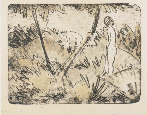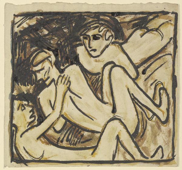 Editor: This is Otto Mueller's "Bathers," possibly from 1920, done in ink. The harsh lines and obscured figures create a really unsettling atmosphere. What do you see in this piece, in terms of its cultural background? Curator: This work speaks volumes about the evolving representation of women in the early 20th century. The Expressionist style reflects a shift away from idealized portrayals toward a raw, more subjective depiction of the female form and its relationship with nature. The lack of distinct facial features seems to flatten them into one, is it intentional or is it a general view of all woman kind at the time? Editor: So, the abstraction and obscured identities challenge traditional gender roles, almost as if suggesting women are only meant to fit certain moulds, to blend in? Curator: Precisely. The sketch-like quality emphasizes process and immediacy, which, in its time, rejects the meticulous, academic approaches to art making that had historically marginalized women artists. It’s an act of reclaiming space, making visible experiences previously ignored or suppressed, don’t you agree? Editor: I think so, yes. And the lack of conventional beauty standards makes it seem like Mueller is stripping away societal expectations placed upon women's bodies. Curator: Exactly. It reflects broader societal changes regarding women’s rights, representation, and agency. The Expressionist movement provided artists the opportunity to engage in critical dialogue about social injustices through raw expression. Editor: It’s interesting how art can reflect these wider cultural shifts. I never looked at it that way before! Curator: And understanding the artistic conventions gives it added depth. There is a lot of potential for future consideration around the representation of women.