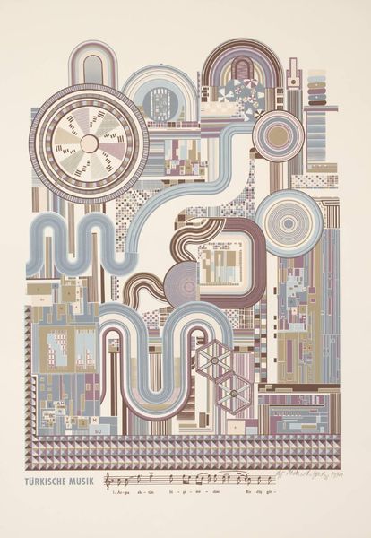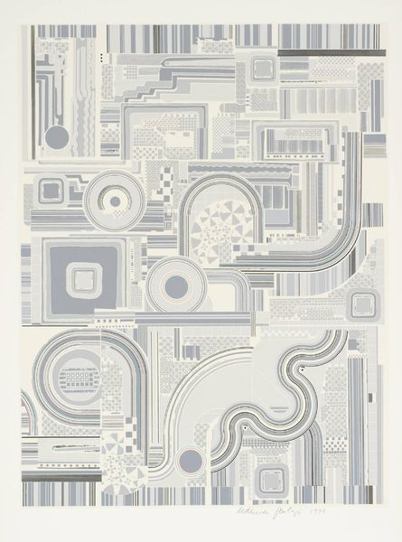Curator: Here we have Sir Eduardo Paolozzi's "Leonardo," part of the Tate Collections. Editor: My first impression is how muted the palette is; it's almost soothing, despite the chaotic composition. Curator: Paolozzi was deeply engaged with technology and popular culture. This piece seems to recall the visual language of circuit boards, or perhaps city planning. Editor: Absolutely, the repeated motifs and geometric forms might symbolize interconnected systems or perhaps the psychological impact of industrial design. It's interesting that he titles this "Leonardo," as if drawing a line between Renaissance invention and modern technology. Curator: The layering of forms creates a sense of depth, almost like peering into the workings of a machine. I can't help but wonder about Paolozzi's own relationship to the rise of technological advancements. Editor: It's a powerful image, holding both the promise and potential alienation of our increasingly technological world. The muted color scheme adds a layer of melancholy, doesn't it? Curator: It does suggest a sort of detached observation, a commentary on the pervasive influence of these systems in our daily lives.