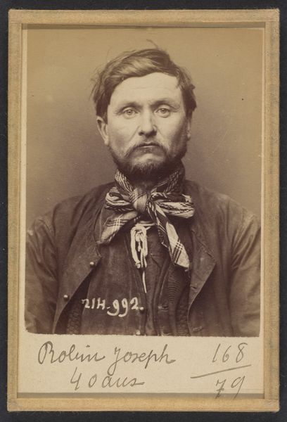 Editor: Here we have "Anacléto. Joseph, Jean-Baptiste. 36 ans, né le 14/7/57. Coiffeur. Anarchiste. 16/3/94" a photographic print from 1894 attributed to Alphonse Bertillon. It strikes me as a strangely intimate and detached image all at once. How would you interpret this work? Curator: It’s a fascinating piece, isn't it? To me, it whispers stories of revolution and repression, you know? The subject's very ordinary—'coiffeur,' 'anarchiste'—it's scrawled right there. But behind that moustache and jacket… well, what do you imagine when you hear the word 'anarchist'? Editor: Rebellion, resistance maybe… but I also think of disorder. Curator: Exactly! And that’s the brilliance, isn't it? Bertillon’s piece, though technically “artless” portraiture, speaks volumes about how society labels and attempts to contain those who challenge the status quo. Notice how the clinical style fights with the romance of those curls… it's like a soul wrestling with categorization. Makes you wonder, doesn't it, how much of our identities are imposed upon us? Do we define ourselves, or do systems define us? Editor: That’s really insightful. I never thought of a photo as an argument, but this definitely feels like one. Thanks for opening my eyes. Curator: Anytime. It's all about looking *past* what’s there, feeling for the tremors underneath. Every image holds a universe; some universes just whisper a bit louder.
