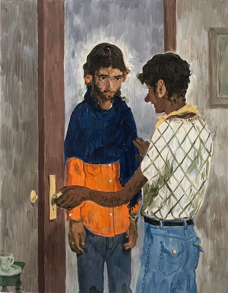 Curator: Welcome. We're standing before Salman Toor’s "Arrival II," an oil painting from 2019. The scene depicts two figures in what appears to be an intimate interior setting. What’s your first impression? Editor: There’s an almost hesitant, melancholic mood hanging in the air. The light seems muted, focusing on the interaction between the two men, and it lends a slightly awkward atmosphere to the space. Curator: The artist employs a distinctive painterly style, focusing not so much on capturing realistic details as on using color and brushstrokes to convey feeling. Notice the swirling quality in the background. Semiotically speaking, how might we interpret the threshold they occupy? Editor: Well, doors always suggest transition. Given that this is called "Arrival II," I'd say we're meant to consider the implications of someone new entering an established space – the power dynamics inherent, for instance. I’m curious about Toor’s intention in depicting this specific encounter. Curator: I’m drawn to the composition – the doorway acts as a framing device, while the slightly tilted perspective adds an element of instability, subtly enhancing that feeling of uncertainty. Also note the color palette. The artist relies on an understated range, mainly focusing on browns, pinks and whites, as well as cooler shades like blue that further emphasize the scene's intimacy. Editor: Thinking about Toor’s background, and his work generally engaging with themes of diaspora and identity, I can’t help but read the figures in relation to those wider contexts. How notions of home, belonging, and acceptance might play out in queer social spaces, for example. Curator: Indeed. Also consider the formal aspects, the surface. The deliberate flattening of forms emphasizes the two-dimensionality of the canvas, and yet it allows for a profound psychological depth in portraying human relationships. Editor: Ultimately, paintings like this are incredibly potent as mirrors reflecting contemporary anxieties and experiences, while simultaneously nodding to artistic conventions of portraiture and genre scenes. Curator: Very insightful. I appreciate how our distinct viewpoints illuminate its subtle complexity, moving from brushstroke to socio-political context. Editor: Agreed. Analyzing artworks through a mix of approaches offers such a richer engagement, doesn't it?