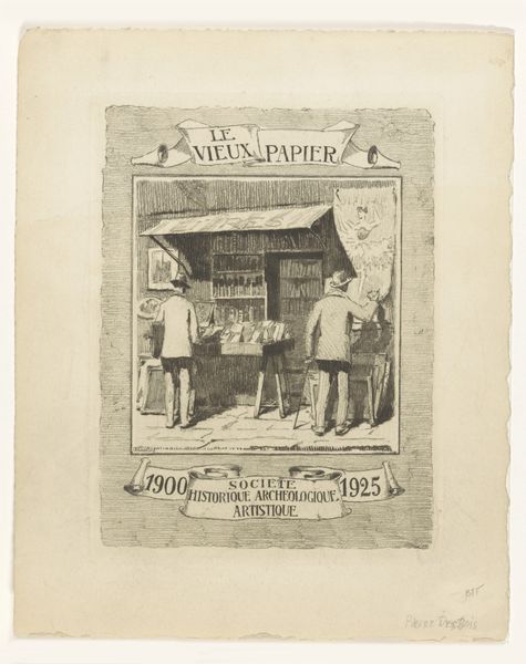 Willem Geets created this print of a man behind the door of a tailor shop using etching techniques. In the late 19th century, Europe underwent rapid industrialization and urbanization, profoundly altering social structures, work and class identities. Geets’ depiction of the tailor shop serves as a microcosm of this evolving society. The tailor, possibly of Jewish heritage, appears confined yet present, his image mediated by the shop's entrance. Text in German 'Man Spricht Deutsch' emphasizes the presence of minority communities. This detail reflects the complex cultural landscape of the time, where diverse ethnic and linguistic groups coexisted amid rising nationalism. The facade of the shop, adorned with signs and symbols of trade, suggests a blend of tradition and modernity. The checkered floor hints at a deliberate construction of identity within the commercial space. Geets captures a moment where personal identity and professional life intersect. He invites reflection on how individuals construct their identities within shifting societal frameworks.