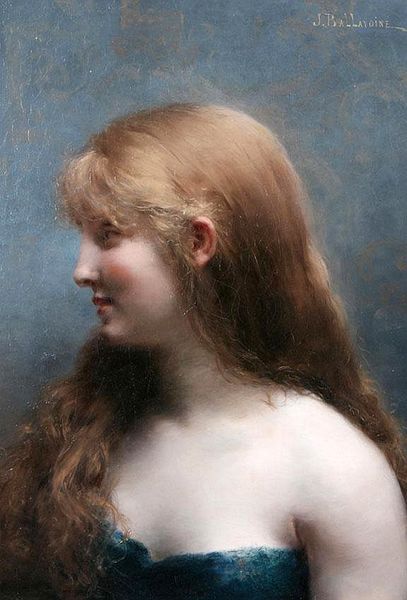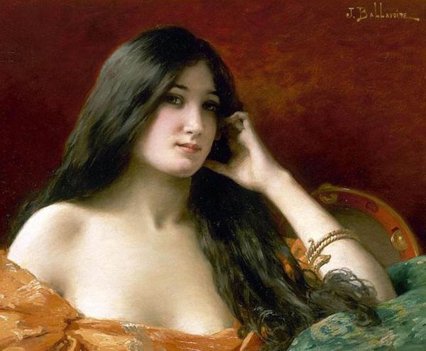 Editor: Here we have Alexei Harlamoff's "Auburn Haired Beauty," an oil painting. The woman’s serene profile against the dark backdrop evokes a quiet, almost melancholic mood, don't you think? The details in her hair, especially, are just captivating. What initially captures your attention in this piece? Curator: Oh, it’s absolutely that dance between light and shadow! See how Harlamoff uses it to sculpt her face, to give her this ethereal glow? It feels like he’s trying to capture not just her likeness, but a fleeting moment of introspection. Her gaze is averted. I find myself wondering, where is her mind traveling? The wisps of auburn feel alive, almost like tendrils of thought escaping her head. Editor: That's a beautiful interpretation. Do you think her red hair was chosen purposefully, as a symbolic element? Curator: Absolutely. In art, especially around the late 19th century, red hair became heavily loaded with associations - passion, mystery, even a touch of danger. Rossetti’s models come to mind… Here, I think it's softer. The artist maybe implies intelligence and a fiery spirit beneath a calm exterior, all tied together by that Pre-Raphaelite aesthetic. What do *you* think of that tension? Does it feel forced, or authentic to you? Editor: That's insightful! To me, she looks mysterious, yes, but also so human. I really appreciate that he manages to make a simple portrait have this air of elegance. Curator: Yes! It’s more than just technique; it’s a feeling he evokes. I almost imagine he was enchanted by the light dancing through her auburn locks – trying to preserve that brief spark. The dark background only adds to her mystery and enhances her delicate facial structure. Editor: Well, I certainly have a richer understanding now. Thank you! Curator: My pleasure. Always lovely to chat about how art speaks!