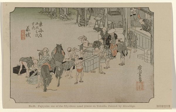 Utagawa Hiroshige's woodblock print, "Changing Porters and Horses at Fujieda," offers us a glimpse into 19th-century Japan. Hiroshige, working in the Edo period, captured everyday life with a unique sensitivity. Here, we see the social dynamics of travel, with figures from different social strata interacting at a staging post. While wealthier travelers might have enjoyed more comfortable amenities, the print also foregrounds the labor of the working class. Notice the almost bare-bodied porters, their physical toil contrasting with the more formally dressed merchants and officials. What does it mean to see such explicit representations of labor? How does Hiroshige engage with the social realities of his time, showing the hierarchies and dependencies inherent in travel and trade? The emotional heart of this work lies, perhaps, in its unvarnished depiction of daily life. It's an image that invites us to reflect on the lives of those whose stories are often overlooked.