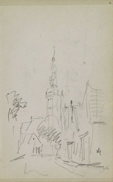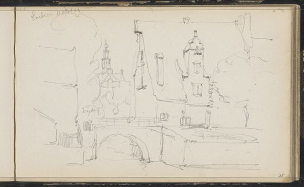 Editor: So, here we have Cornelis Vreedenburgh's "Stoomlocomotief," a graphite and pencil drawing done sometime between 1890 and 1946. It feels like a quick sketch from a personal sketchbook, almost like a fleeting impression. What jumps out at you? Curator: The immediate appeal lies in its directness and economy of line. Notice how Vreedenburgh uses hatching to build up tone and volume, particularly in the depiction of the locomotive's cylindrical forms and the contrasting verticality of what appears to be a church spire. Do you observe any tension between these elements? Editor: I do. The sketch feels like a study in contrasts – the soft, almost hazy depiction of the architecture against the harder, more mechanical rendering of the locomotive. Does this contrast offer any insight? Curator: Precisely. The rough handling of the pencil emphasizes the materiality of the medium, drawing attention to the artist's process. We can almost sense the speed and decisiveness of his hand. Consider also the composition: the positioning of these objects and how they may relate. Does that suggest a theme for this drawing? Editor: Maybe a commentary on the industrial revolution juxtaposed with traditional cityscapes? A visual shorthand for progress, perhaps? The artist probably chose the medium to evoke nostalgia. Curator: The value of such artworks exists intrinsically, in its lines and composition, even above cultural or historical meaning, which can be fluid or transient. It might seem so different through the lens of Formalist principles. Editor: I appreciate that; that emphasis on the art object itself helps me to see beyond just the apparent themes of progress, and more how line, medium, and the drawing come together. Curator: Indeed. Every line and mark contributes to a network of meanings which reveals both the artwork and ourselves.