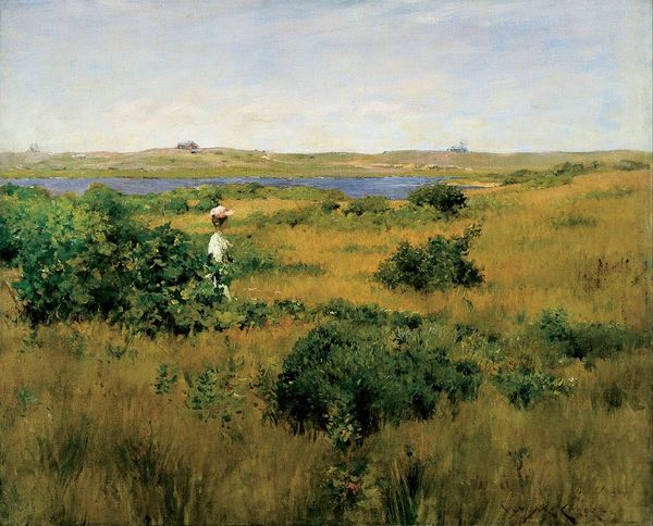 Curator: The expansive composition really captures the specific geography, and its attendant cultural history, don't you think? Editor: It definitely evokes a sense of vastness. The muted color palette gives it an almost melancholic feeling, as if observing the landscape through a wistful lens. Curator: We’re looking at William Merritt Chase’s “Landscape – A Shinnecock Vale,” painted in 1895. Chase spent considerable time at Shinnecock Hills on Long Island, where he mentored students, painting en plein air. It's worth noting, this location had previously been tribal land used for hunting, fishing, and gathering before colonial settlement, part of the displacement and forced labor so familiar. Editor: I am struck by the seemingly hurried application of the paint. I wonder what the materiality suggests about its social and economic context, given that Chase was instructing, essentially producing, alongside his students. Curator: Absolutely. You can see the influence of Impressionism here – capturing the transient effects of light and atmosphere through the medium. Consider the material properties of the paint, thick impasto in areas, giving a tactile quality to the foliage in the foreground. His process embodies the era, focusing on immediacy and observation as both pedagogy and artistry. Editor: Do you see in its muted color choices and slightly melancholy landscape perhaps an aestheticization of loss—the transformation of native lands into bourgeois leisure destinations? Or maybe I am projecting too much contemporary angst? Curator: Perhaps. But remember Chase wasn't unique. Many landscape artists romanticized places with troubled histories. Still, to think critically, we must situate this work, produced during the height of the Aesthetic movement, within the context of urbanization, industrialization, and Indigenous displacement. Editor: Looking closely, I am curious how much did his students contribute practically to this piece and others like it? How much collaboration versus demonstration was involved in Chase's landscape output? The labor question really jumps out for me. Curator: A vital question, indeed! One that invites consideration of these landscapes not just as aesthetic objects but also as products of collective work—a visual record imbued with social and political layers. Editor: It's easy to just admire the view, but there is clearly a lot more to consider here. Curator: Precisely. This conversation demonstrates that even serene landscapes can contain complex dialogues about history, labor, and place.