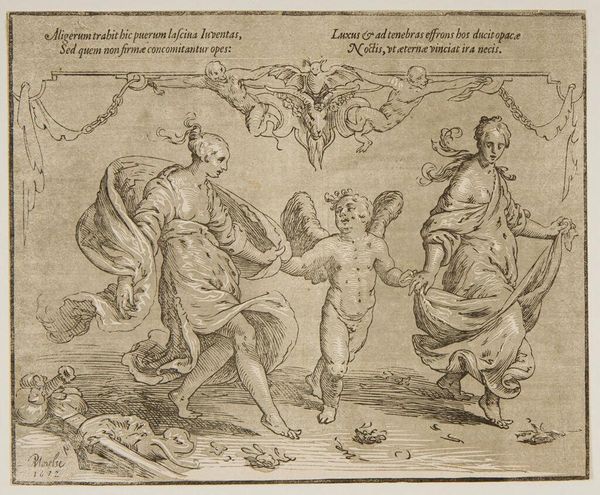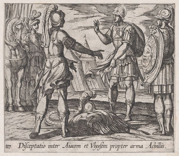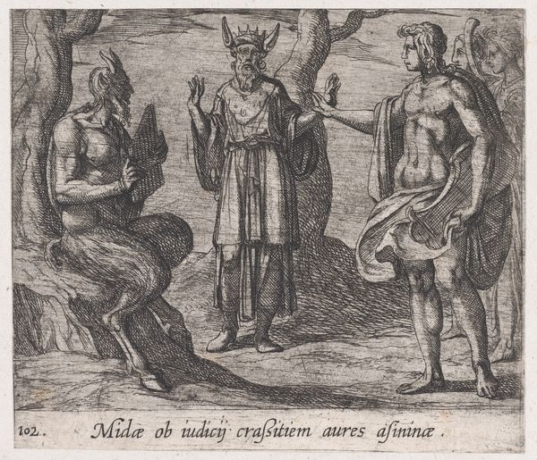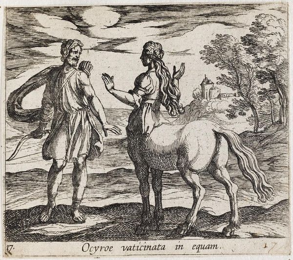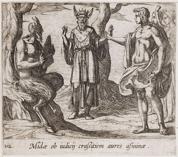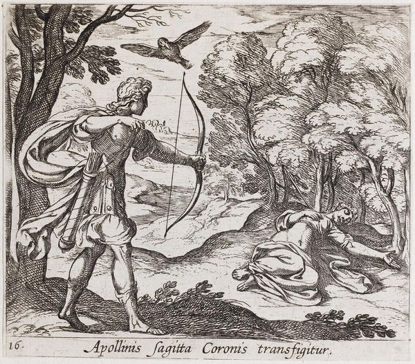 Curator: This small yet powerfully rendered etching is Antonio Tempesta's "Cyparissus Changed into a Cypress Tree." Editor: It's rather stark, isn't it? The composition feels unstable, almost frantic. Curator: Note the cross-hatching; Tempesta employs it masterfully to create depth and volume, particularly in the figures' musculature. Editor: Musculature which is undeniably gendered. Considering the myth's themes of loss and transformation, I wonder how Tempesta's depiction reinforces certain masculine ideals of grief. Curator: The precision and control are what strike me. He transforms Ovid’s tale into a study of form and line. Editor: And yet, that transformation is inherently linked to power. Apollo's role in Cyparissus's fate speaks to broader social structures of dominance and enforced change. Curator: A compelling reading. It enriches our understanding of Tempesta’s technical skill. Editor: Absolutely. I find that it reframes the narrative into a cautionary tale about unchecked authority.