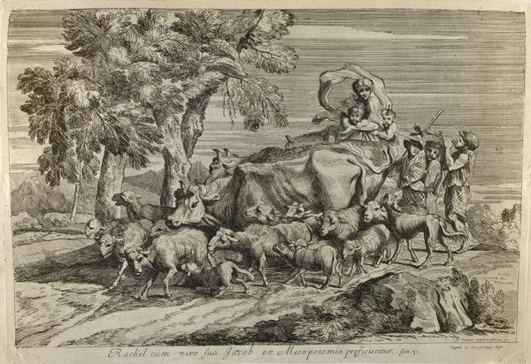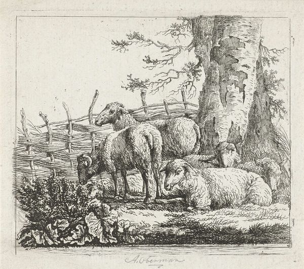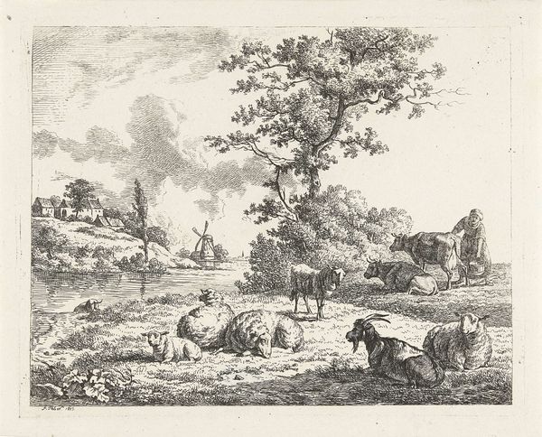 Curator: Today we're looking at "Varkenshoeder met kudde varkens," or "Swineherd with a Herd of Pigs," created around 1670 by Johannes Gronsveld. This Dutch Golden Age piece employs etching, ink, and pen to depict a genre scene firmly rooted in a Baroque aesthetic. Editor: Pigs! There are so many pigs, and they look hot and tired, splayed out as though they just finished a marathon. The line work is incredible, teeming with chaotic energy but held in place by that calming pastoral landscape in the background. Curator: The artist has very cleverly structured the composition. Notice how Gronsveld contrasts the dark, detailed foreground of resting pigs with the lighter, almost ethereal rendering of the trees and distant buildings. It’s a juxtaposition that pulls the eye through the plane. Editor: It makes me think about the rhythms of country life—that cyclical sense of labor and rest, dark and light. I wonder what stories Gronsveld was told about this landscape, if it mirrored his childhood, a place that he longs to capture in this ink drawing? Curator: The piece indeed touches upon themes deeply resonant with the Dutch Golden Age—the everyday, the moral undercurrents of simple lives, and an undeniable connection to nature. I note in particular Gronsveld’s deft use of line weight, which is deployed almost sculpturally. The details! The bristling hair on the pigs, the texture of the wood—it’s quite astounding! Editor: I like the little details, too. The person talking, or maybe yelling, off into the distance... What are they saying? I think this picture asks us to make up our own mind as to what is actually going on in this scene. Curator: I appreciate the way you frame it as an invitation to storytelling, but I also believe in analyzing how these components coalesce into a formal arrangement. Editor: Right. So what story does the formal arrangement tell us, then? Curator: Perhaps one about finding serenity amidst life's disarray, wouldn't you say? Editor: Hmmm… I think that resonates pretty well, actually! It certainly gave me something to chew on!