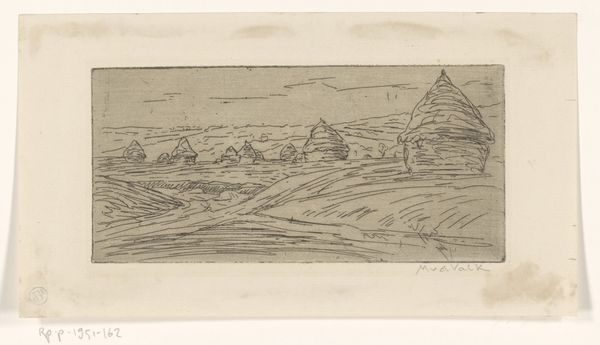 Curator: Welcome. Here we have Johannes Frederik Engelbert ten Klooster's "De baai," created around 1920. This compelling woodcut print presents a serene, stylized landscape. Editor: Whoa, there's something almost graphic novel-y about this piece. All those sharp lines make it seem stark but also super intentional, you know? It's like, controlled chaos in black and white. Curator: Indeed. The stark contrast of black and white, coupled with the geometric forms, aligns this work with the visual language of Art Deco. This period also sees a rise in the aesthetic interest and commodification of ‘the Orient’, as it was known at the time. The print uses the woodcut medium effectively, lending a distinct texture and boldness to the overall composition, nodding perhaps to an orientalizing aesthetic prevalent during the early 20th century. Editor: Yeah, there’s that sense of ‘faraway lands,’ a postcard image but without the sappiness. Like, look at those pine trees, almost aggressively symmetrical and precise—and the mountain in the background sliced with lines. Reminds me of a stylized Japan. Is this maybe Ten Klooster's comment on exoticism? Or fascination, even? Curator: That is a valid observation. During this time, a critical lens might consider that the artist reproduces orientalist notions by flattening a place and culture to geometric lines for the gaze of Western consumption. In terms of influence, it appears to have connections with Japanese woodblock printing and maybe, further along, modernist landscape experimentations by the likes of the German Expressionist group, Die Brücke. Editor: All these crisp forms really flatten the scene, almost making the boats appear two-dimensional. And there's a meditative quiet despite that heavy, carved black ink, like a single deep breath you take when trying to keep calm. That black is just devouring the image almost, in an attractive manner. Curator: Precisely, the composition and subject position the artwork within broader discourses of landscape art. We have to remember that landscape as a concept can encode ideas around territory, nation, identity and even, dare I say it, ownership. And then, what does it mean to create or recreate or to sell, and own a landscape? What do we appropriate or lose? Editor: It does make you wonder, huh? I get so wrapped up in those shapes, and you just made me aware of bigger forces and concerns here. Curator: Understanding context enhances our viewing. I’m so glad that this work of ten Klooster opened itself for consideration from aesthetic and ethical vantage points. Editor: Absolutely, food for thought indeed. I think I'll be chewing on this visual "byte" for the rest of the day.