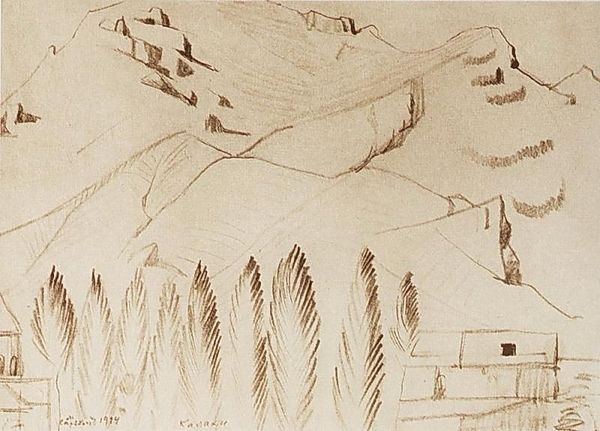 Curator: This drawing is Martiros Sarian's "Fairy Tale," created in 1907 using pencil and graphite. Editor: It has the delicate quality of a quickly rendered sketch. The monochromatic landscape feels almost dreamlike, as if glimpsed from the corner of the eye. Curator: The loose handling of the pencil emphasizes the scene’s structural components: we see a progression from a robust tree in the foreground to gently rising hills and mountain in the background. The work offers a composition dominated by the interplay of light and shadow. Note how he utilizes varying pencil pressure to convey texture and volume, particularly within the dominant tree. Editor: Sarian likely draws inspiration from the romantic, Symbolist tradition, using fairytale and fantasy in relation to political changes across Europe at this time. Fairy tales become very popular. Curator: I see this landscape more as an exploration of form, devoid of political and social narrative, if only a slight exploration. He seems to capture nature’s inherent structures. It’s evident in the deliberate arrangement of shapes; notice the strategic placement of animals. They are more abstract than realistic. They serve compositional roles, like notes in a visual symphony, if you like. Editor: They contribute to the mystical atmosphere. This image seems to depict a return to nature, rejecting industrial progress and seeking solace in a nostalgic landscape, where harmony and escape are possible. The drawing would likely have functioned as both an expression of hope and an imagined rejection of progress in art production, in a return to craft and the individual. Curator: Perhaps. Either way, the reduction to grayscale amplifies the linear quality, doesn’t it? Consider the economical yet precise pencil work, constructing forms in relation to the others—landscape elements speaking silently across a symbolic plane. It becomes a system for organizing the image and our perception. Editor: Ultimately, Sarian's “Fairy Tale” allows us to reflect on the power of imagination and the persistent appeal of storytelling during times of great social change. Curator: Or just his interest in pure form! Regardless, an intriguing example of subtle yet striking artistic efficiency.