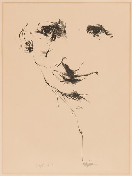 Curator: This is Leonard Baskin's "Hidatsa Medicine Man," created in 1972 using ink, and presented here as a print. Editor: The stark black ink on the white background creates such a striking image. The figure is incredibly dignified, despite the somewhat unsettling expressive lines defining his face. Curator: Baskin's work often explores themes of mortality and the human condition. His interest in indigenous cultures, here the Hidatsa people, is significant, reflecting the relationship between culture, spirituality, and the impact of colonization. The “medicine man,” or spiritual leader, embodies cultural continuity and resistance against external pressures. Editor: Absolutely, and technically speaking, the bold, almost brutal, strokes create a sense of immediacy and power. Notice how the lines vary in thickness and direction to give dimension to the profile while maintaining a flattened perspective overall. Curator: The visible marks from the printmaking process give it an aura of authenticity. But it also begs the question, as a non-Indigenous artist, what are Baskin’s ethical responsibilities in portraying such a culturally significant figure? Can representation truly be respectful, or does it inevitably contribute to appropriation? Editor: That tension you describe makes the artwork complex. What is evident is the artist’s close study of form—look at the subject’s jewelry and the lines that emulate hair—with a powerful gestural economy to delineate both literal and figurative qualities of the represented person. Curator: Indeed. His intense gaze and noble posture project resilience in the face of historical trauma, acknowledging their enduring presence and value in contemporary society, and the ongoing fight for cultural recognition. Editor: Seeing it this way helps clarify some of my reservations with Baskin's technique. Perhaps those harsh lines were employed in an attempt to depict an equally tough character who prevails despite the forces opposing him. Thank you for pointing out the historical factors behind the portrait! Curator: It is crucial to consider both historical context and aesthetic value when experiencing this image. Editor: An interesting perspective to conclude our discussion—the fusion of form and history in shaping our understanding.