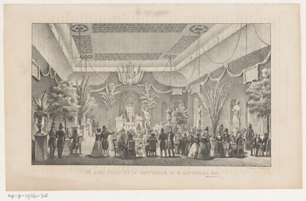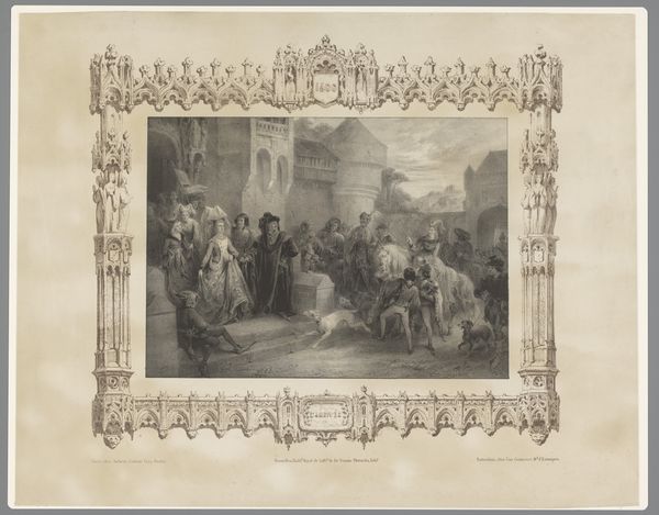 Curator: Immediately, the print feels like an elaborate stage set for a theatrical tableau of Danish domesticity. The formal composition, almost symmetrically arranged, leads the eye towards the centre. Editor: Yes, the artist Emil Bærentzen captured a potent sense of national pride after the First Schleswig War. This lithograph, using ink and drawing techniques, is entitled 'Mindeblad over troppernes hjemkomst efter krigen 1848-1850', commemorates the homecoming of troops between 1850 and 1867. It hangs here at the SMK. Curator: Observe how the intertwined family scenes and the festive parade blend seamlessly. The artist uses light and shadow to create distinct areas of interest within the print. What strikes me most is how the composition is clearly defined by two symmetrical interiors framing the external street scene, marked by the floral arches and crowds. The romantic style, juxtaposing scenes of familial embrace and uniformed soldiers, reveals that central parade. Editor: And this speaks volumes about the period's values, doesn’t it? It's more than just homecoming; it’s about weaving the soldiers back into the fabric of civilian life, legitimizing them into the Danish family unit, underscoring the state-building narrative post-war. The imagery serves as propaganda. The celebration acts like symbolic healing. Curator: I would say it operates almost as a diptych; there’s the public spectacle and private relief on display, linked formally through the arch. Do you see the use of curvilinear forms which underscores a sense of unity throughout? I want to linger on that arch as it becomes the key structure in our understanding. Editor: Agreed. Its ornate detailing also implies official patronage or at least endorsement from societal elites. You notice that the scenes almost act as a play within a play? Bærentzen creates an artificial construct to show Denmark's social and emotional aspirations at the time. It's powerful! Curator: Definitely. By employing a lithographic method, Bærentzen ensures that these cultural ideas are disseminated amongst an audience, therefore embedding the values within them. Editor: Examining it further, we realize its success lies in how Bærentzen transformed national anxieties and then, neatly, celebrated triumphs into a manageable, domestic narrative. Curator: It reveals just how meticulously constructed national sentiment can be through seemingly innocuous genre scenes. Editor: And just how impactful art is as a historical document! Thank you for clarifying its composition and symbolism for our visitors.