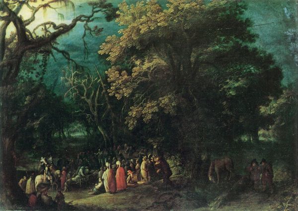 Editor: We're looking at "Feast in Park," an oil painting by Jean-Antoine Watteau, created in 1713. The work captures a gathering of people in what looks like a forest or park setting. The overall impression I get is one of relaxed leisure, but the dense trees also give a sense of mystery, and a romantic melancholy. How do you interpret the imagery at play here? Curator: Indeed, Watteau often worked with a theatricality of form – a commedia dell'arte of social codes and disguised desires. Do you see how the garden, while seemingly natural, is in fact highly arranged, populated with classical statues and theatrical groupings of figures? This tension speaks to a cultural memory of Arcadian ideals clashing with contemporary social artifice. Editor: That’s interesting. So the landscape itself is a symbolic space? Curator: Precisely. Consider the figures themselves – their gestures, their clothing. They’re enacting a particular kind of leisure, one deeply tied to aristocratic identity. Notice how their poses and interactions are not quite naturalistic, but stylized, almost performative. They are simultaneously enjoying and performing leisure. Do you recognize in their features anything like 'types', perhaps recalling classical statuary? Editor: I see what you mean now; they're like figures in a staged drama. The poses look deliberate, as if struck for an audience. Curator: Yes, it evokes the feeling of watching actors playing archetypes in a pastoral drama. The iconography evokes deeper cultural themes of pleasure, artifice, and the elusive nature of happiness itself. A park is nature tamed, not nature as the realm of divine providence but the province of humanity. Editor: This makes me see so much more than just a pleasant day in the park! It’s a sophisticated commentary, wrapped up in a beautiful scene. Curator: Exactly. Watteau uses these lighthearted images to invite the viewers to a rich space where a seemingly innocent image can have a lasting effect, becoming more than a snapshot in time, or place. The images serve as reflections on our shared experience, of a longing for both freedom, and belonging.