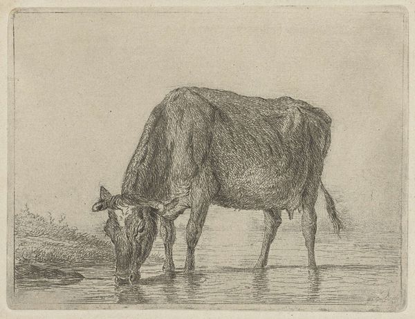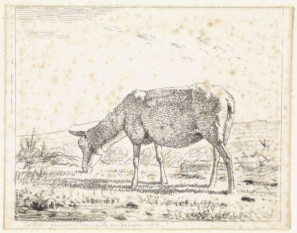 Editor: This drawing, "Grazende stier in een wei, naar rechts" or "Grazing bull in a meadow, to the right," is a pencil work by Jean Bernard, dating from 1775 to 1833. I’m struck by the simplicity and seeming tranquility of the image. What social narratives or critical interpretations do you see in this sketch? Curator: Beyond the pastoral tranquility, consider the historical context. The late 18th and early 19th centuries saw increasing agricultural intensification. This image, seemingly benign, participates in a complex power dynamic—the taming and representation of nature, where the landscape and its creatures are subtly rendered as resources. Who benefits from this representation and at what cost? Editor: That's interesting! I hadn't considered the drawing within a framework of land use and control. How does the artist's choice of medium affect that reading? Curator: The pencil, a relatively accessible tool, democratized image creation, yet this very accessibility also normalized certain views of the rural. Consider also how images like these circulated – whose gaze were they intended for? Did the image reinforce societal ideas around gender and race, such as an implicit "ownership" of land by certain demographics? Editor: So it’s not just about the bull, but also about power structures and representation in that historical period? Curator: Precisely! This work invites a discussion about land, labor, and who gets to define “nature.” By examining its place in that broader context, we can unearth narratives that challenge any idyllic interpretations. How does this new perspective affect your view? Editor: It definitely complicates it. It makes me think about the ethics of representation, and the layers of meaning that exist beneath the surface. Thanks, that was insightful! Curator: And for me, you've spotlighted the seemingly banal and highlighted the artist's deft ability in creating images that invite deeper reflection, prompting vital dialogues about our past and its impact on the present.