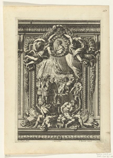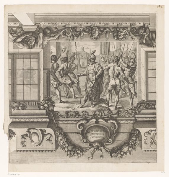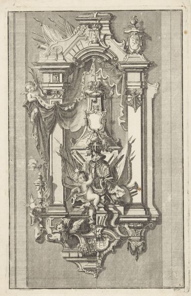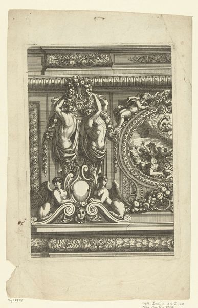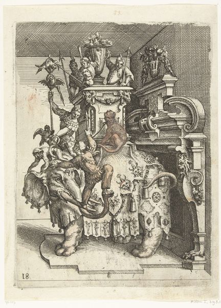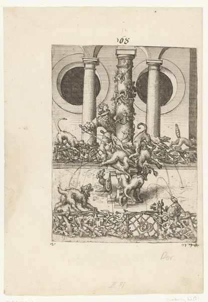 Editor: Here we have Wendel Dietterlin's "Fantastic Fountain with a Fisherman and a Hunter and Dogs Fighting a Badger," a print from before 1595. It's incredibly intricate, almost chaotic, in its detail. There’s so much happening in the image. How do you interpret this work? Curator: This piece is so rich with cultural meaning! Let’s unpack it. The Mannerist style reflects a society grappling with shifts in power and religious upheavals. Consider the fountain itself – not merely a source of water but a performative display of wealth and dominion. Who is entitled to such an ostentatious demonstration? Editor: I see what you mean. It’s definitely excessive! So, the fountain as a symbol of power? Curator: Precisely! The hunting scene speaks to the control of nature, further highlighting themes of social hierarchy. Think about the representation of animals: are they simply decorative, or do they reflect societal anxieties about the wild versus the civilized, the noble versus the common? Editor: That’s a perspective I hadn’t considered. It's not just about the hunt, but about taming the natural world to reflect dominance. What would you say is Dietterlin's point in making such art? Curator: He uses Mannerism to represent power struggles. His goal is less to glorify but to open up an artistic space of excess and artistic licence, almost beyond comprehension. Who and what are worthy to receive all this abundance, to have everything on display? What, then, does abundance represent in a class and race context? Editor: It completely changes how I see it! Now it is like it embodies so many issues we still grapple with. Curator: Right! By connecting these historical contexts with contemporary social issues, we reveal the enduring power dynamics embedded within the work. I learned today from our collaboration that our work together matters so that more people consider art a call for dialogue.
