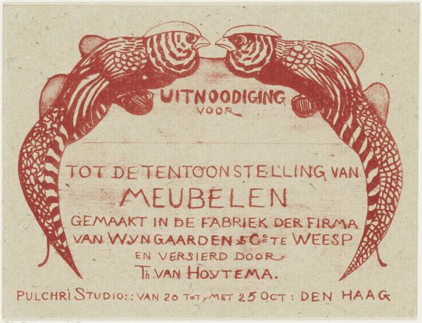 Theo van Hoytema created this invitation with two grasshoppers in 1898 using lithography. Notice the symmetrical composition, where mirroring isn't just a visual technique but a structural principle, creating balance and harmony. The linear quality of the work emphasizes form over volume. Observe how the grasshoppers and botanical elements are rendered with meticulous detail. The decorative border, filled with flowers and insects, frames the central text, drawing our eye to the announcement. This stylistic choice highlights the function of design as a carrier of textual content. The restricted palette promotes unity, but also speaks to the broader aesthetic movement of the time. We see the influence of Art Nouveau, which embraced natural forms and stylized ornamentation. This invitation transcends its practical function, becoming a statement about art's role in everyday life. It invites ongoing interpretation of form, function, and aesthetic value.