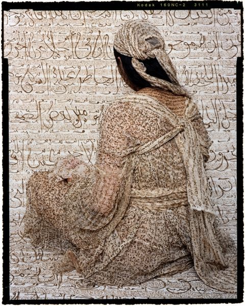 Shirin Neshat made "Seeking Martyrdom" using photography and hand-applied media, and it’s a piece that really gets under my skin. I see Neshat working with the image, adding layers of meaning and texture through those handwritten texts. The woman's face is so present, so full of feeling. The way Neshat uses color, especially that shocking red on the hands holding the flower, it’s not just decoration. It’s visceral; you feel the weight of the story, the potential for violence, and the complex relationship to sacrifice. And then you have the text, swirling around her like a whispered narrative. It’s applied with a delicate hand, but it speaks volumes about cultural and religious identity, about the role of women, and about power. It reminds me of the way Barbara Kruger uses text and image, but with a completely different emotional register, more intimate and personal. It embraces ambiguity, and this is where its power resides.