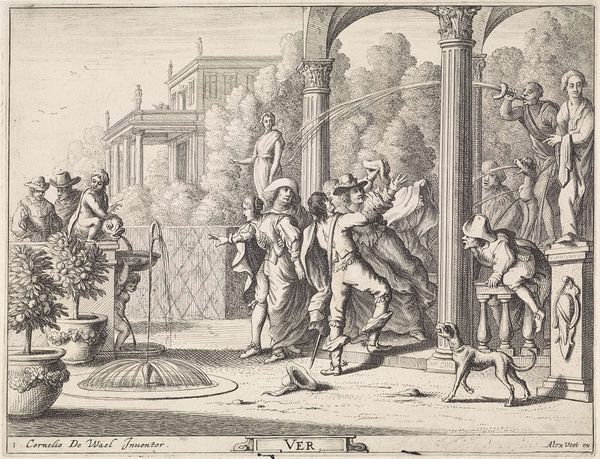 Curator: Looking at this print, "Scene Two," by Johanna Sibylla Kraus, I'm struck by how it captures a moment both grand and intimate. The etched lines create a dynamic scene, full of architectural details and figures in motion, now residing at the Harvard Art Museums. Editor: It feels like peeking into a dream, doesn't it? All those lines, creating so much depth, and that central figure radiating light...there's a real sense of heightened drama in this little world. Curator: Absolutely, and if we consider the period in which Kraus was working, the print’s architectural setting speaks to the ongoing dialogue between religious and civic power. The composition, with its clear foreground and receding background, creates a stage for this encounter. Editor: Yes, it's as if the architecture itself is a character, framing the central interaction! And the figures, with their varied poses and expressions... are we witnessing a revelation, or perhaps a tense negotiation? Curator: It's open to interpretation, which is, I think, part of the print's enduring appeal. What seems certain is that Kraus, likely working within a male-dominated art world, created something that invites curiosity. Editor: I agree. There is something so intimate about this Scene. And it's wonderful to consider the work of an artist who might have felt like an outsider looking in, creating this whole world through such careful etching.