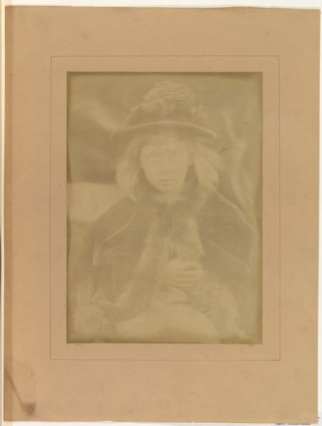 Curator: Today, we're examining a gelatin silver print from 1873 by Julia Margaret Cameron. Its title, quite simply, is “[Unidentified Child].” It's currently held in the collection of the Metropolitan Museum of Art. Editor: Instantly, it pulls me in. The fuzzy focus gives it such an ethereal quality. It’s less a sharp representation, and more of a dream, or a faded memory of childhood. It’s wistful and strangely compelling. Curator: Cameron was very deliberate in her technical choices. The out-of-focus aesthetic aligns her work with the Pre-Raphaelite movement. Think of the emphasis on emotion and beauty over photographic realism. We observe that the softness here acts as a compositional element, diffusing light across the surface and concentrating visual attention on the subject’s face and hands. Editor: True, that softness, it's almost like she's wrapped in a cloud of feeling, doesn't it? I see her art more as a personal quest to find and freeze emotion. The slight melancholia that lingers in her gaze; it whispers stories about her life we'll never fully understand. It's far deeper than capturing likeness; it's about capturing essence, I suppose. Curator: And indeed the subject, swaddled in fur, transcends simple portraiture, gesturing towards deeper symbolic readings about innocence and vulnerability. Editor: Vulnerability indeed! And don't get me started on that fur! It feels like she is swallowed by its protective hug and yet it gives her vulnerability a heightened appearance. It speaks volumes about that tightrope between fragility and resilience that comes to mind when dealing with our own children and their lives! Curator: The subdued sepia tones work with the soft focus and serve to imbue the photograph with a sense of timelessness. It avoids stark contrasts. The even, diffuse lighting helps flatten the perspective and enhance the photograph's dreamlike feel. Editor: Exactly, it is more than meets the eye. It's the art of imperfection perfected. I love the blurred lines, that it forces us to really feel instead of merely seeing! It feels so much more truthful this way, don't you think? Curator: In contemplating this ethereal portrait, it prompts reflection about beauty and visual aesthetics and their link with psychological insights and individual emotions. Editor: I agree. In the end, for me, the artwork reflects how it touches my soul. The imperfections and the quiet stillness linger with you long after you've moved on. It has truly earned its spot.