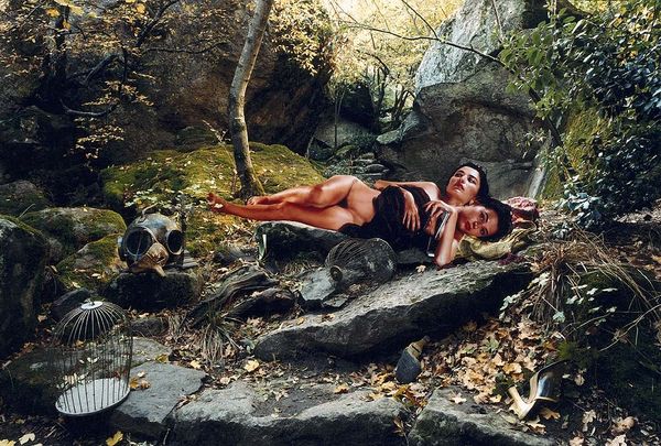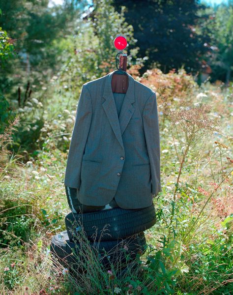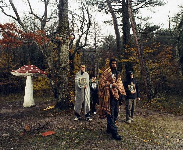 Curator: Let's talk about Arsen Savadov's photographic work, "Last Project" from 2002. It presents a tableau within a wooded landscape. What's your initial read? Editor: A certain stillness pervades, almost a theatrical hush. Two figures are situated within this seemingly remote woodland—a rather staged naturalism that provokes thought about land use and identity. Curator: Savadov often blends staged portraiture with broader societal commentaries. Focusing on materiality here, look at the fabrics and clothing. One figure seems almost nomadic, wrapped in patterned textiles; the other surrounded by bundled items. These elements seem quite intentional. Editor: Indeed. It seems Savadov stages not simply the image, but a commentary on consumerism through found materials and labor in creating these assembled bundles. Note the contrast in attire between the figure with the blanket and the one amongst the crafted assemblage. How does their labor diverge? Is it posed as labor at all? Curator: Good question. The setting itself, perhaps functioning as a backdrop to that material commentary, is interesting. Savadov places these individuals within a carefully chosen section of woodland. How do you read this blend of culture and its setting? Editor: It begs the question of displacement. The individuals seem somewhat out of place, like refugees or itinerants. The work raises questions regarding societal margins, the socio-political climates from which this imagery emerged and what social norms it sought to either emulate or interrogate. Curator: Consider that this was produced a little over a decade after the breakup of the Soviet Union. Does that have an impact? Editor: Absolutely, Savadov offers a quiet reckoning with Ukraine’s then-recent independence, seen through a lens of constructed identities and lingering anxieties regarding production, sustainability, and the land itself as both provider and contested resource. Curator: A dense and insightful read. It showcases the enduring value and questions this work evokes about culture, commerce, and what images choose to reveal about social structures. Editor: Indeed, a potent testament to constructed realities as a mirror to a constantly-evolving world.