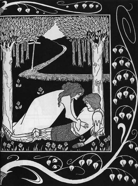 Aubrey Beardsley created "How King Mark and Sir Dinadan Heard Sir Palomides I" using pen and ink, a medium that allowed for the crisp lines and stark contrasts characteristic of the Aesthetic movement. Beardsley, working in the late 19th century, was deeply immersed in the cultural currents of his time which challenged Victorian norms. This piece, intended for an edition of "Le Morte d'Arthur," speaks to the Victorian fascination with Arthurian legends. In Beardsley’s hands, it becomes a site to explore themes of masculinity, desire, and the artificiality of social roles. Notice how Sir Palomides reclines languidly. Beardsley inverts traditional heroic imagery by depicting the knight in a moment of repose rather than action, blurring the lines between masculine strength and feminine passivity. Beardsley often used the male body to challenge Victorian ideals of masculinity and decorum. The image, with its intricate lines and use of black and white, is both decorative and unsettling, drawing us into a world where beauty and artifice intertwine.