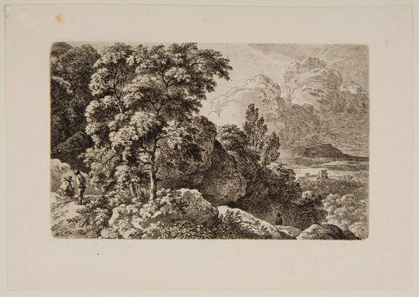 Curator: This is Ferdinand Kobell's "Shepherd Guarding His Sheep," currently residing in the Harvard Art Museums. Editor: The etching’s quite striking; the dense foliage and huddled sheep evoke a feeling of sheltered tranquility, doesn't it? Curator: Indeed. Kobell, active in the late 18th century, often depicted pastoral scenes reflecting the romanticized views of nature prevalent at the time. Editor: I'm drawn to how the tiny shepherd, almost lost on the distant hill, echoes the classical symbol of man's dominion over nature. Curator: The composition is very deliberate, framing the vulnerable sheep within a seemingly protective landscape. One can interpret this as a commentary on societal structures, the shepherd representing a paternalistic authority. Editor: Or perhaps a more universal symbol of care and protection, mirrored in the sheltering trees. It speaks to a timeless need for safety and guidance. Curator: It’s fascinating how a seemingly simple pastoral scene can resonate with such complex cultural meanings. Editor: Absolutely. It's a reminder that even the most idyllic images carry layers of symbolism and historical context.