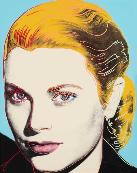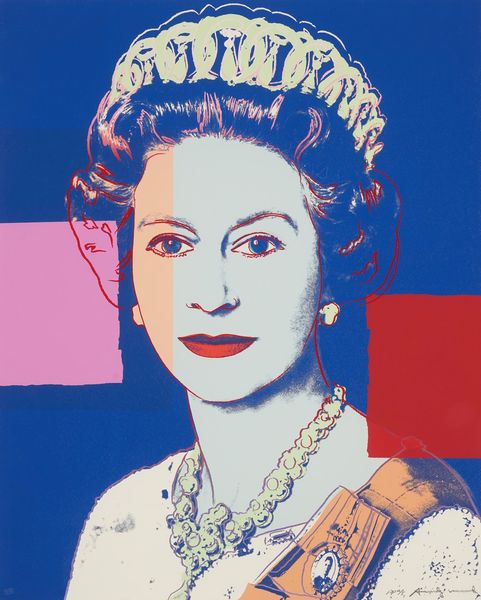 Curator: Let's turn our attention to Andy Warhol's portrait of "Queen Margrethe II of Denmark #1," painted in 1985. Editor: My first thought is how regal yet somehow...flattened the image feels. The blocks of color are so stark and almost aggressively applied. Curator: It's classic Warhol, distilling the monarch into a series of vibrant, simplified planes. You have to consider the era—this was during a time when celebrity and royalty were being repackaged and commodified through media. Warhol captured this societal shift brilliantly. The portraits were created using acrylic paint, in line with the bright and graphic approach characteristic of pop art. Editor: The pastel background clashes beautifully with the deeper blues and teals of her gown. And look at how Warhol suggests the highlights of the crown and jewelry with only a few deft strokes of yellow. It’s visually arresting because of its economy. Curator: Exactly! And it is important to acknowledge the subject. By painting the Queen of Denmark, Warhol was engaging with a very specific power structure. He often depicted figures already imbued with cultural significance—and royalty certainly falls into that category. It’s an intersection of high society and popular art. Editor: It’s interesting how Warhol plays with positive and negative space. The silhouette is instantly recognizable, but he actively disrupts any sense of classical portraiture through the fragmentation of form. Curator: Yes, the disruptive aesthetic choices create a commentary on celebrity and constructed image. He flattens her, almost making her into a brand while celebrating her image. This piece certainly reflects his exploration of the cult of celebrity and the commercialization of everything, even royalty, during that decade. Editor: Considering the relationship between his artistic vision and the way he deploys form and color really unveils Warhol's unique brand of cultural commentary. It reveals so much! Curator: Precisely! A blend of socio-historical significance and stylistic ingenuity; that's where its power lies.