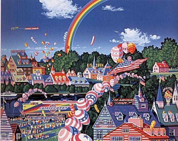 This is "Bubbles," a print created by Hiro Yamagata, capturing a Parisian street scene. Here, the ephemeral nature of bubbles dances against the backdrop of steadfast buildings. The rainbow, an archetypal symbol of promise, bridges the gap between the gritty rooftops and the lively street. Consider the rainbow, its arc appearing in myths across cultures—from Iris, the Greek messenger goddess, to its biblical appearance as a covenant of hope. It embodies a connection between the earthly and the divine, a bridge between states of being. The bubbles, by contrast, represent transience. Bubbles appear in art, in Dutch vanitas paintings, as symbols of the brevity of life, a reminder of mortality amidst material wealth. In Yamagata's composition, the rainbow and bubbles create a tension, engaging our collective memory, inviting us to reflect on the balance between permanence and change. These symbols tap into our deepest hopes and fears, forming a bridge between past and present, reflecting life's cyclical nature.