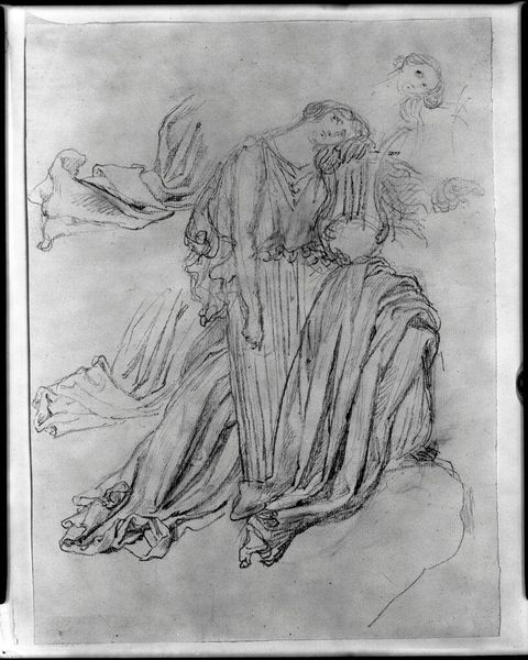 Curator: Looking at this, I immediately feel a sense of quietude, almost melancholy. The soft pencil strokes and the draped figures evoke a feeling of resignation. Editor: Indeed. This is Edward Burne-Jones' "Two Studies of a Seated Figure, Study for 'The Sleep of Arthur at Avalon.'" The drawing, which is undated, offers us insight into Burne-Jones' process as he conceptualized his Arthurian scenes. Curator: The absence of facial features in the figures is particularly striking. It shifts the focus to the body language and the folds of the drapery, which, in turn, amplifies the feeling of anonymity, of universal grief perhaps? Editor: It's interesting how Burne-Jones uses these figures as studies, almost placeholders. Their emotional weight comes from their association with Arthurian legend, a narrative that carried so much cultural significance in Victorian England. Curator: I agree. The symbol of Arthur sleeping in Avalon resonated deeply with the anxieties of the time, touching upon themes of loss and longing for a mythical past. Thank you for sharing this! Editor: It's fascinating to consider how Burne-Jones used such intimate sketches to engage with larger political and social currents.