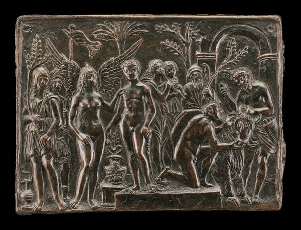 Paulus van Vianen created this silver relief of the Adoration of the Shepherds in the early 17th century. Note the shepherds, common men, gathered in reverence around the newborn Christ, a humble scene charged with symbolic weight. Consider the shepherds' crooks: ancient symbols of guidance and care, echoing pagan images of Hermes, the protector of flocks, and how such symbols are later adapted into Christian iconography. The shepherds gesture towards the infant, linking gestures of reverence across cultures, from ancient Roman orators to Byzantine religious figures. This gesture speaks to the powerful need to express devotion, a need that transcends time. Above, angels bear witness, their presence a celestial chorus. These figures connect to the motifs found in ancient art where winged figures bridge the gap between the divine and mortal realms. It’s a visual echo of humanity’s long-standing fascination with the heavens. These evolving motifs tap into our collective unconscious and stir deep emotional responses, reminding us of the cyclical nature of human experience.