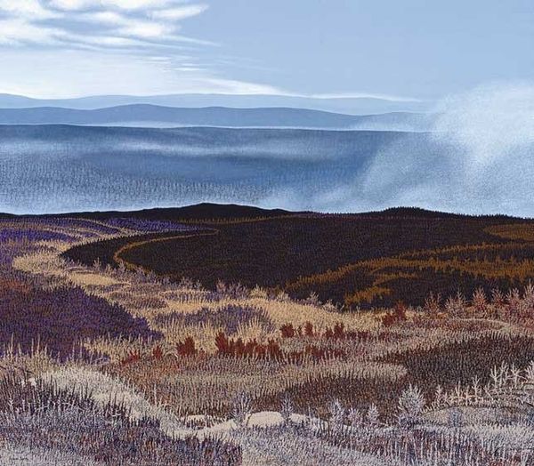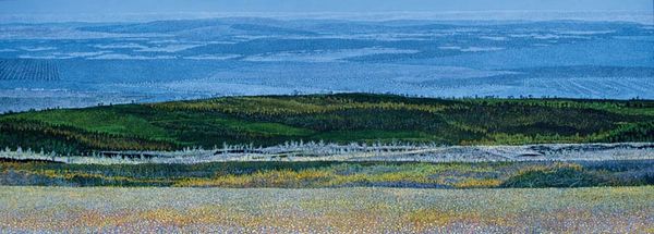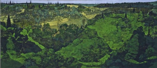 Editor: This is "North Northwest" by Ivan Eyre, made in 1980 using oil paint. The texture is amazing! What strikes me most is the sheer labor involved in creating such a detailed landscape. How do you interpret the technique used to depict such a vast scene? Curator: Absolutely. Eyre's intensive brushwork – look at how each stroke builds up the image – speaks volumes about the physical act of creation. It challenges our romantic ideas about "plein air" painting, doesn't it? What materials were accessible to Eyre at the time? Editor: That’s interesting. It looks as though the oil paint may be quite thick and there's detail upon detail across the landscape, implying considerable access to those materials. Would you say there is any socioeconomic commentary being presented in that case? Curator: Precisely! The materiality of the paint and the sheer volume of work point towards a certain level of resource availability. Consider also the landscape itself – a seemingly untouched wilderness, now depicted using industrial materials like processed oil. How might that reflect on our consumption and transformation of natural resources? Editor: So, by examining the oil paint itself and the method of production, we can start to understand broader societal implications regarding labor and resources, as well as question this seemingly pristine scene! Curator: Exactly! The "how" becomes as significant as the "what." By interrogating Eyre's process, we're not just seeing a landscape, but uncovering a commentary on production, consumption, and our relationship with the environment. Editor: This materialist perspective is really illuminating. I'll definitely look at paintings with a fresh eye now, thinking about more than just the subject matter. Curator: Indeed. Never underestimate what materials and production methods can reveal.