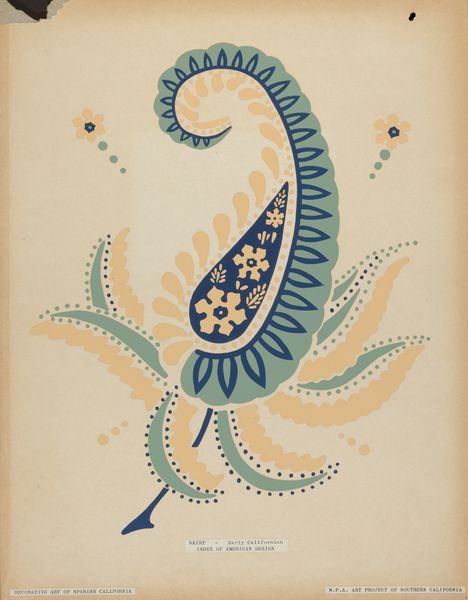 Editor: This is Plate 4 from the portfolio "Folk Art of Rural Pennsylvania," circa 1939, an anonymous drawing and print on paper that feels distinctly like a celebration of nature through geometry. The shapes are so deliberate, yet evoke something quite wild. How do you see this artwork functioning as a record of folk art, but also as an art piece in itself? Curator: That's a brilliant observation. To me, this isn’t just a historical record. It sings with a deeply intuitive understanding of design. See how the unknown artist reduces a complex natural form to these potent, almost symbolic shapes. Red, blue, gold...they aren’t mimicking life but amplifying it, distilling it. Perhaps more than mimicking, it seems more as a translation into another language. What would you say that new language is communicating to you? Editor: Maybe… a simplified, harmonious vision of nature's exuberance. It's not realistic, but it feels truthful about the joy of encountering the natural world. Curator: Exactly! It’s a dance between representation and abstraction, echoing traditions found in indigenous art across the Americas, a celebration of patterns. Think of it, an artwork referencing a historical object which is again already itself artistic. What does this hall-of-mirrors effect do for you? Editor: It suggests folk art's ongoing evolution. It isn't static, it’s constantly being reinterpreted and appreciated by different eyes, even today. Curator: Precisely. Each generation rediscovers the rhythm and power in these deceptively simple forms. It invites us all to become folk artists, interpreting the world through our own lenses.