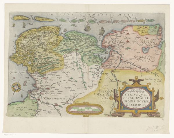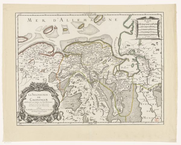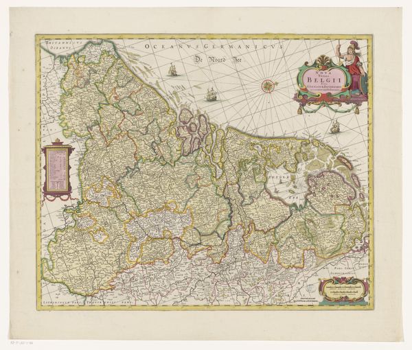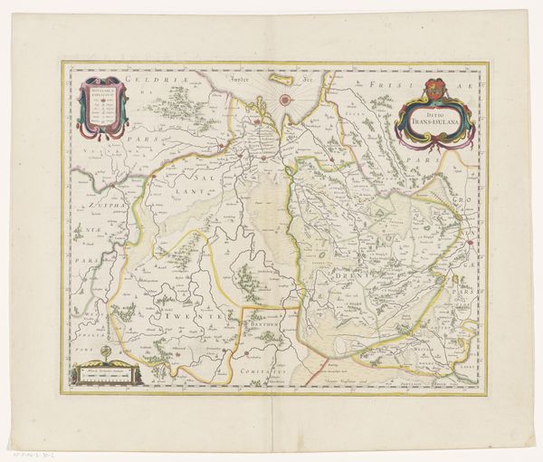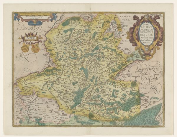 Curator: What a remarkably intricate map! This is a 1633 engraving titled "Kaart van het graafschap Henegouwen," or "Map of the County of Hainaut," created by Joannes van Doetechum. It's currently held at the Rijksmuseum. Editor: Immediately, I’m struck by the almost frantic detail – every little village seems rendered with such careful attention. There's something about this that speaks to ownership and control. Curator: Precisely. Consider how maps, particularly during this era, were powerful symbols. They visualized dominion, making claims tangible and visually asserting authority. The elaborate cartouches, for instance, holding dedications or coats of arms, reinforced a ruling family's power and lineage. Editor: Yes, and it's not just geographical accuracy at play, is it? The landscape itself is a constructed narrative. The size and placement of forests, for example, may be more symbolic than representative of reality. Were they shaping perception as much as charting land? Curator: Absolutely. We can delve into the Dutch Golden Age context; while scientific mapping grew, artistic elements rooted in baroque sensibilities gave rise to dramatic flair in mapping; this means idealized and romantic notions also influenced their depiction of the landscape. The "truth" wasn't simply geographic. The truth becomes enmeshed with social and cultural assumptions of power and order. Editor: This visual hierarchy certainly raises some questions about which communities are privileged and whose existences are possibly elided. For example, did this region encompass territories controlled by various groups with diverse power dynamics beyond nobility and their heraldry on display? It’s tempting to see echoes of ongoing struggles, land disputes and even environmental change concealed within its aesthetic appeal. Curator: A valid question. We tend to read older images differently because over time social norms change about power, possession and display of wealth. The use of heraldic emblems and idealized scenery create continuity for cultural memory through its graphic symbolism. Editor: Absolutely. It reveals more by what is included and what’s not. In understanding these historic cartographies, it is important to consider perspectives and silences while exploring narratives told by art.