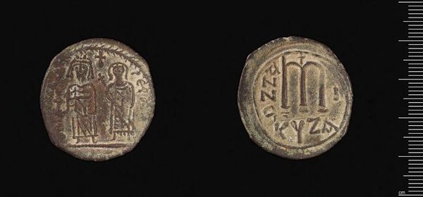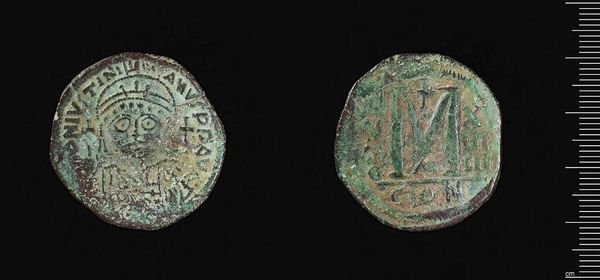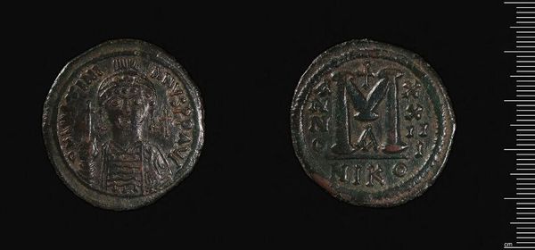 Curator: Here we have a coin, minted under the reign of Justinian I. What strikes you about it? Editor: It feels weighty, substantial. You can almost feel the press of the die used to stamp the image, evidence of the labor involved in its creation. Curator: Indeed. Note the iconography: Justinian's image, framed by carefully rendered inscriptions and symbolic elements. Observe how the composition reinforces his authority. Editor: And the materials themselves speak to power—bronze, meant to circulate, facilitating trade, and solidifying the empire's reach. Curator: Quite, but it is also the artistry itself which elevates it. The coin’s images are clearly laid out and neatly rendered. Editor: True, and thinking about how worn the bronze appears, its distribution and use tells a rich story of the economy of the time. Curator: An interesting lens for looking at power, indeed. Editor: It certainly is.