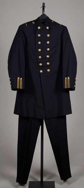 Curator: Standing before us is a military jacket from the period of 1860 to 1864, now held at the Metropolitan Museum of Art. Editor: My first impression is power, almost a theatrical kind of authority emanating from this stiff silhouette and the gleam of the gold. Curator: Indeed. Think about the labor involved—the textile production, the intricate goldwork on the collar and cuffs. This wasn't mass-produced; each button, each stitch speaks to a dedicated craft. The making of this object would be intense, especially considering the state of technology at that time. Editor: Absolutely. And that arrangement of buttons, those striking epaulettes – they’re not merely functional; they impose a visual hierarchy. It creates a clear and dominant silhouette. Curator: Precisely! It underscores the role of military dress in projecting authority and control. One wonders about the life of the tailor, the provenance of the fabrics. All those hours translating somebody else’s vision of military prowess and design. It embodies the industrial realities behind the conflict itself. Editor: And in a broader sense, doesn’t it mirror the structure of military itself? A strict ordering and embellishment masking what undoubtedly was a brutal reality of war. Curator: Exactly. Its very construction—the layers, the tight fit—suggests a kind of armor, psychological as well as physical. One might also look into the class implications... such details could not have been made affordable for the majority of people. Editor: So much presence in such a compact form! This jacket gives one plenty to consider about both its overt declaration of power, and its submerged reflection of humanity during war. Curator: I concur! By focusing on these details, we bring to light the intricate web of power relations, and we start looking at military jacket more holistically and how intertwined labor, class, and the theater of war could be.