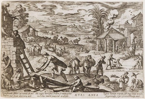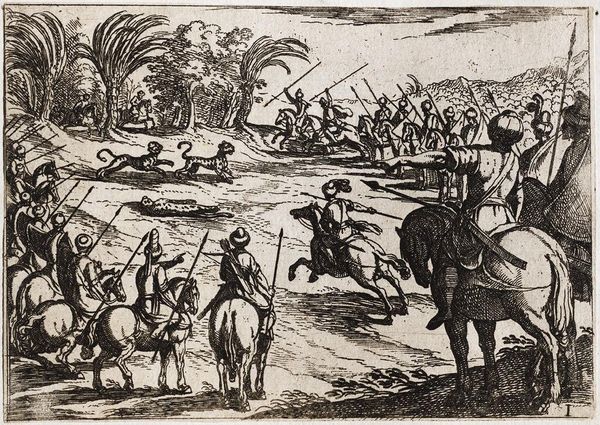 Editor: This is "Hunters Chasing Wild Geese into a Large Net" by Antonio Tempesta, dating back to the late 16th or early 17th century. The intricate detail makes the scene come alive, but there's also something unsettling about the capture playing out. What do you make of this print? Curator: It does have a certain violence to it, doesn’t it? What strikes me is how Tempesta orchestrates the chaos into a strangely balanced composition. The net acts as a focal point, doesn't it? Yet, the hunters, dogs, and geese are all rendered with such dynamism. Notice the meticulous detail of the cross-hatching; it's almost obsessive! Editor: The detail is incredible! I hadn't considered how the net anchors the whole piece. I guess I was too focused on the drama. Thanks! Curator: Art's like that, isn't it? Always more to discover below the surface.