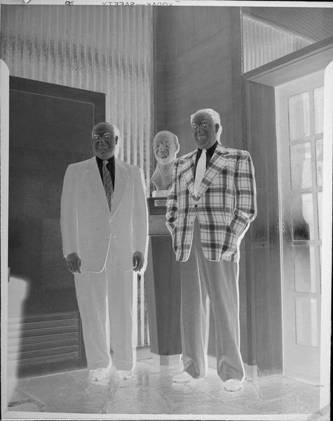 Editor: This is "Untitled (two men standing in office)" by Peter James Studio. It's a black and white photograph. They’re both wearing suits and the one on the right is holding what looks like a document. It gives off a feeling of mid-century corporate America. What historical narratives do you think this image speaks to? Curator: Considering the power dynamics inherent in corporate spaces, particularly during the mid-20th century, this image invites questions about masculinity, class, and access. How does their attire, and the setting of an office, contribute to a reading of privilege and authority? Editor: It's true, the suits project a certain image, almost like a uniform of power. Curator: Exactly! And who was typically afforded that privilege during that period? This photo is more than just an image; it’s a conversation starter about the structures that shape our society. Editor: I never thought about it that way. Thanks for the insight.
